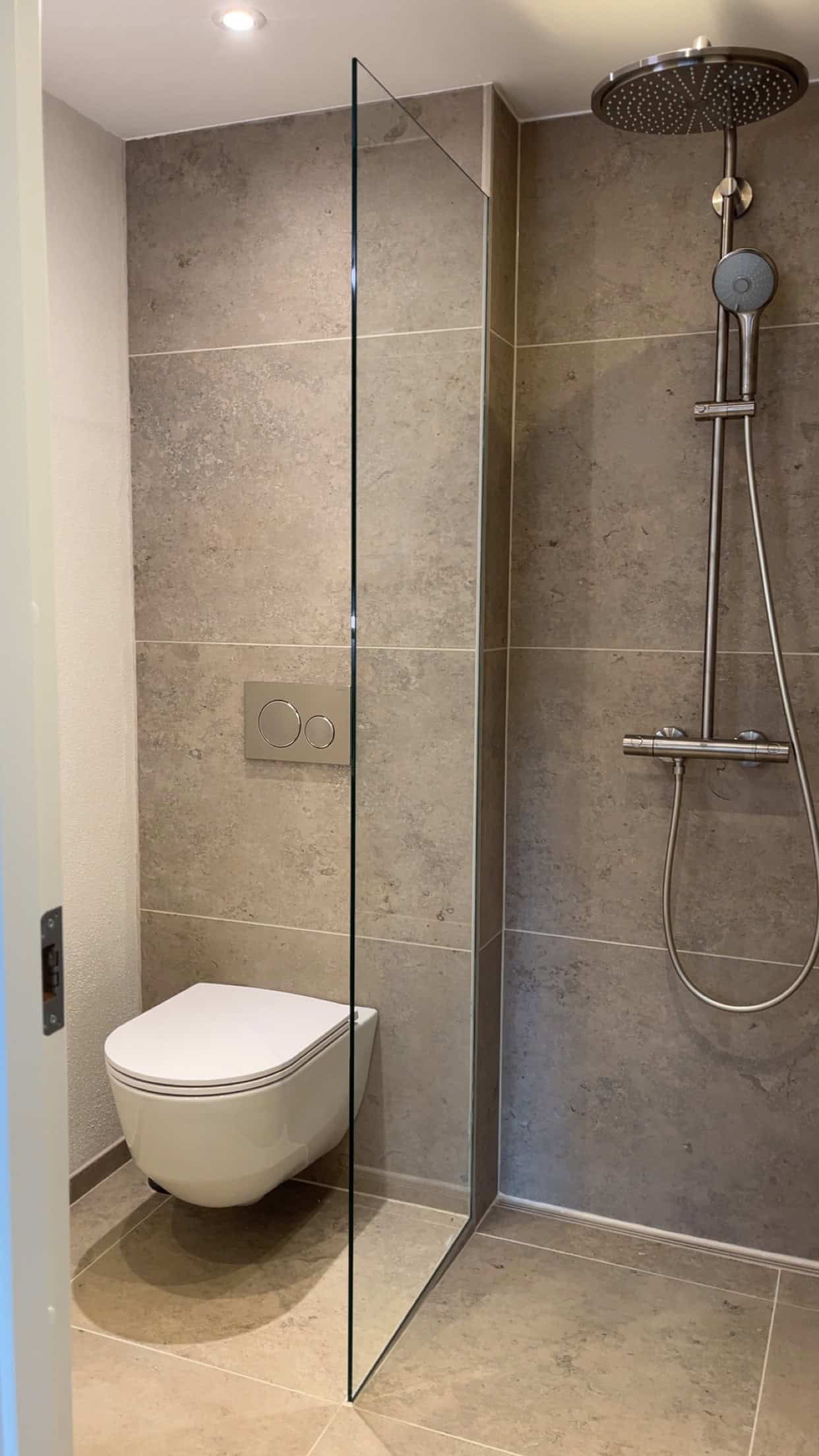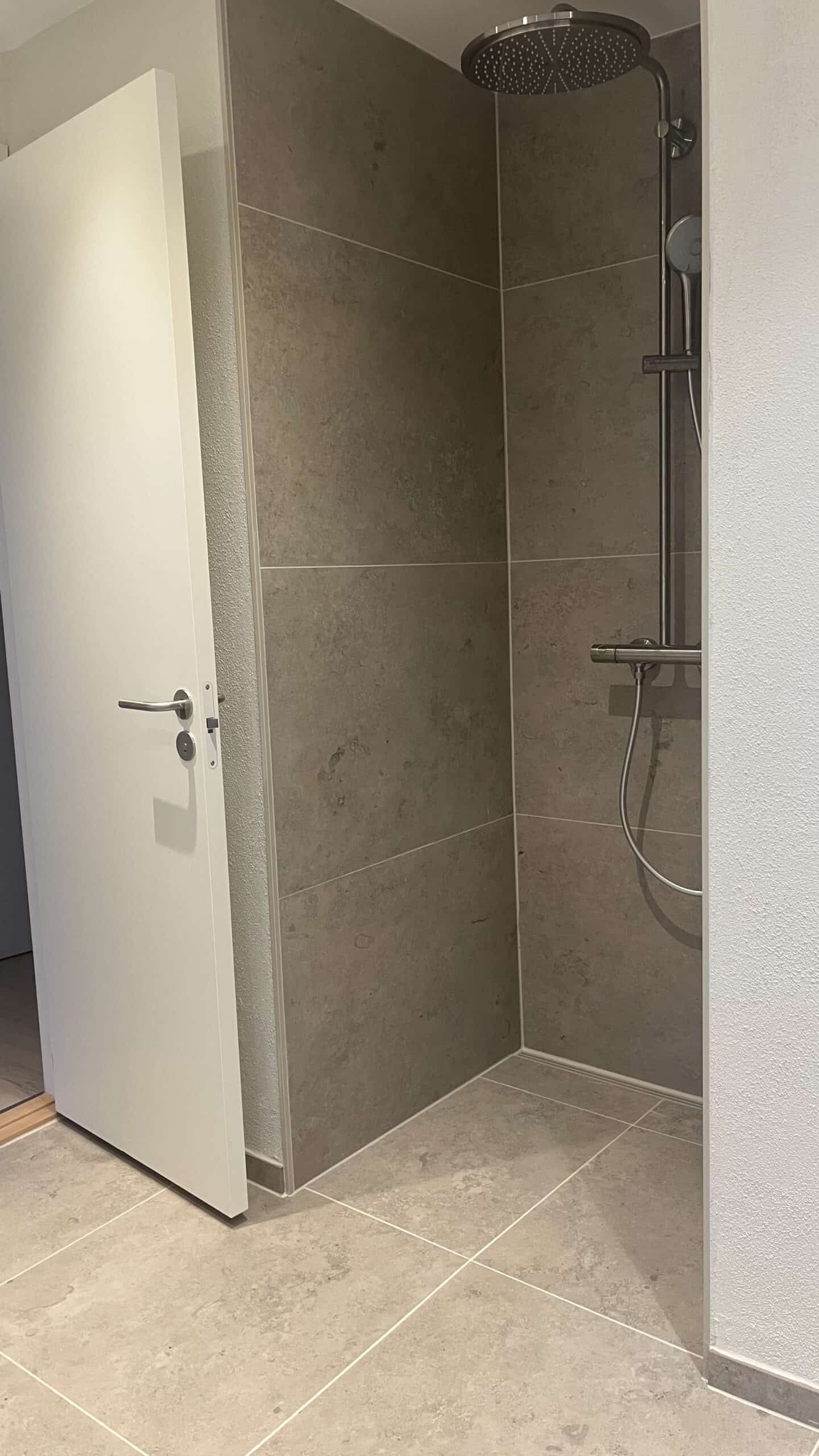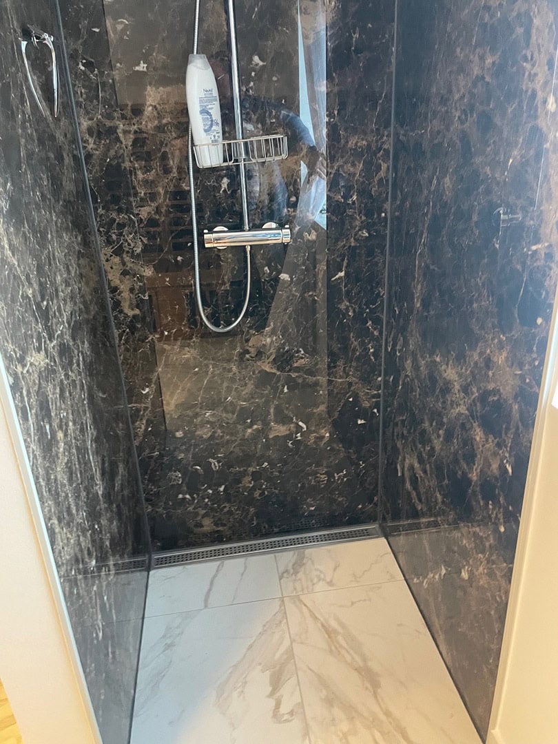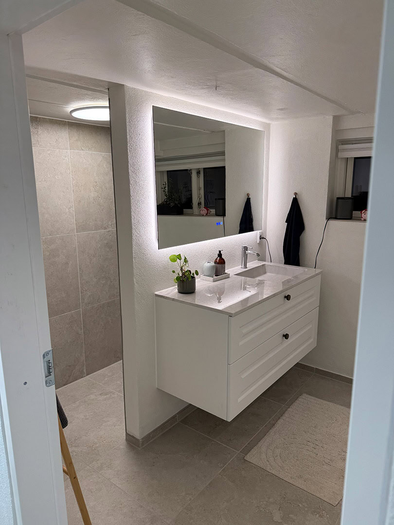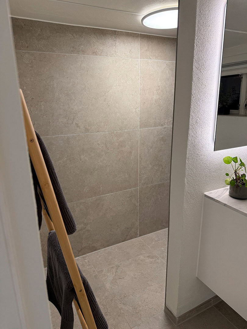 Vi har benyttet Schlüter Systems (Ditra Heat) til el-gulvvarme og vådrumssikring, mens væggene er sikret med Kerdi 200. Fliserne er Jura fra FliseDesign, monteret med profiler og afløbsrende i matchende farver.