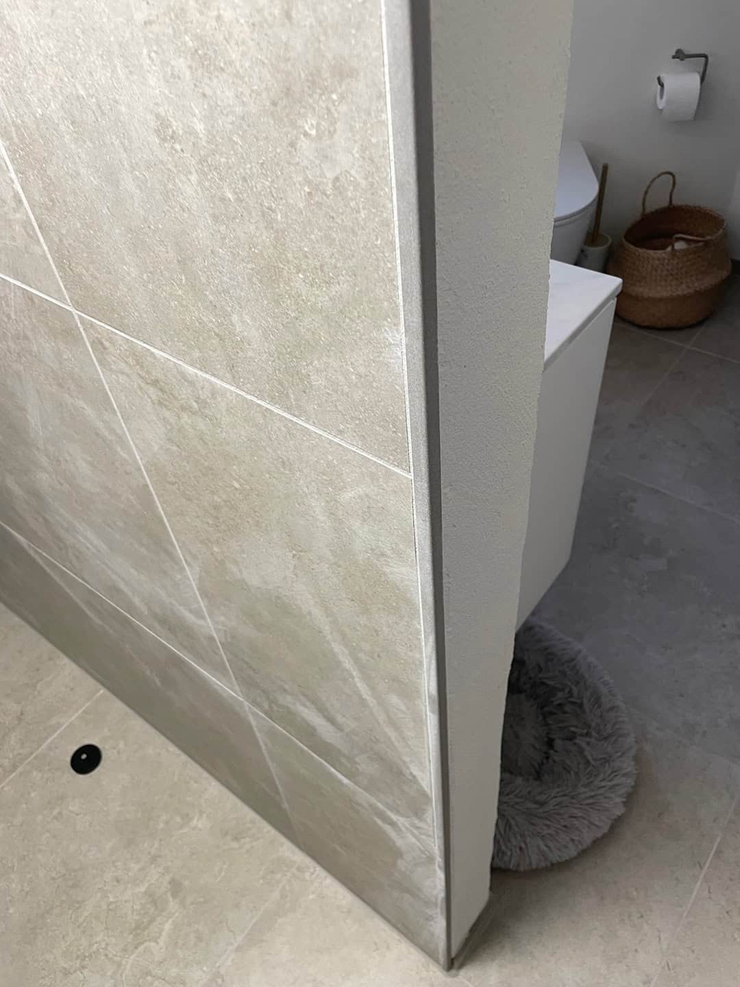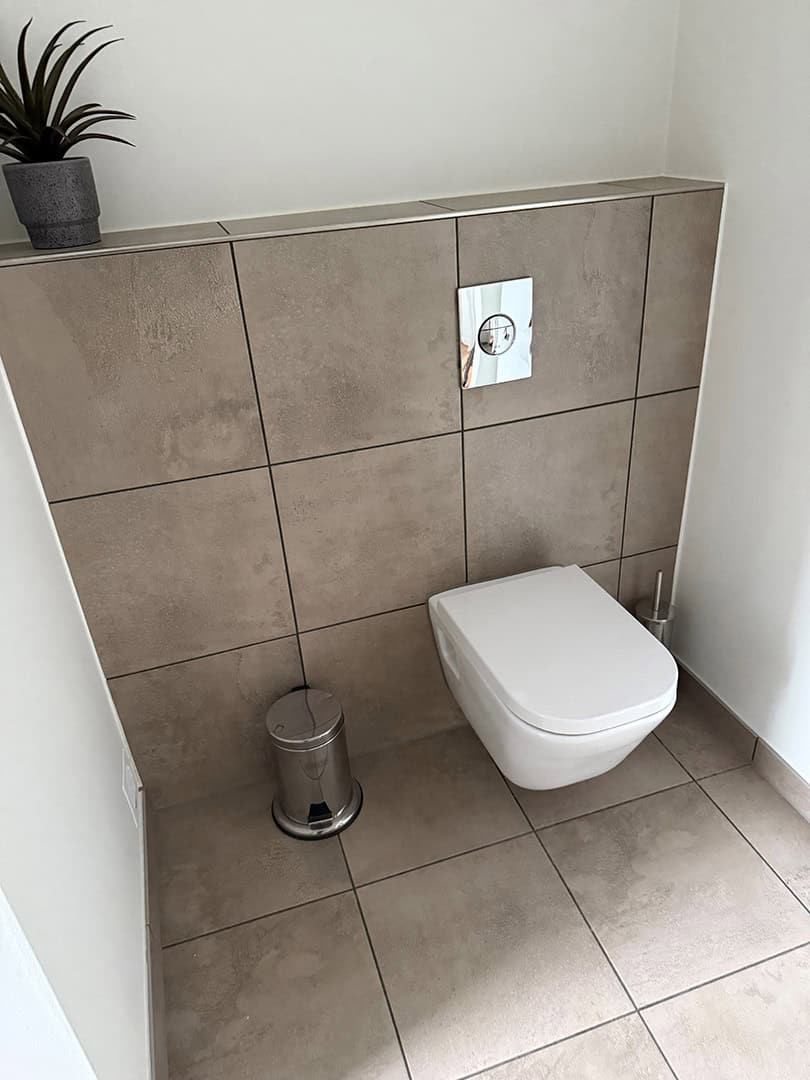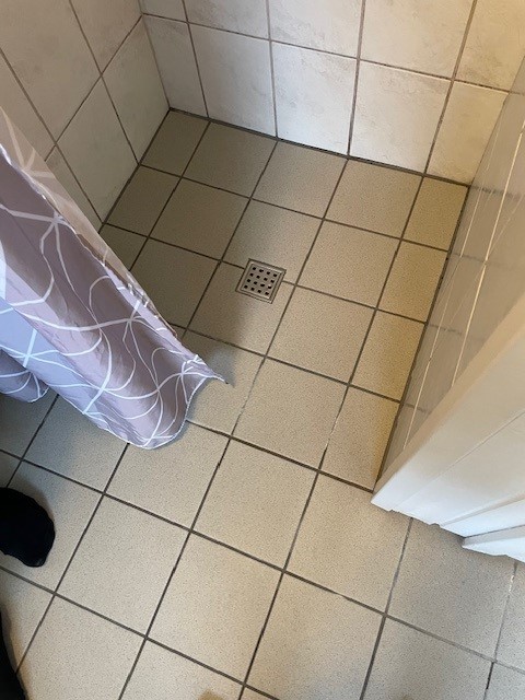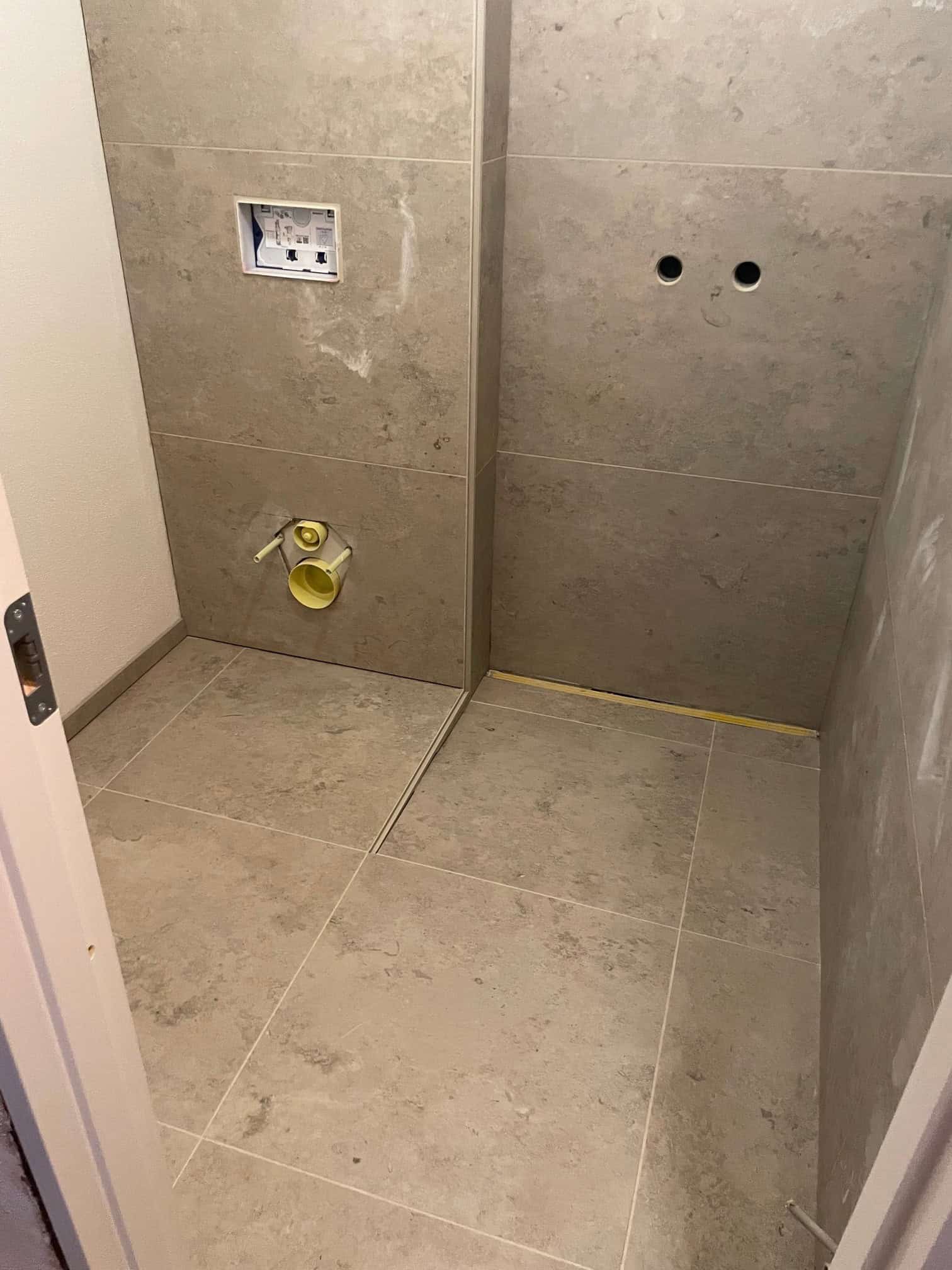 Her har vi udbedret to badeværelser på 1. sal, der var ramt af utætheder og sætningsskader i både gulv og vægge.