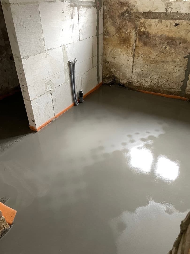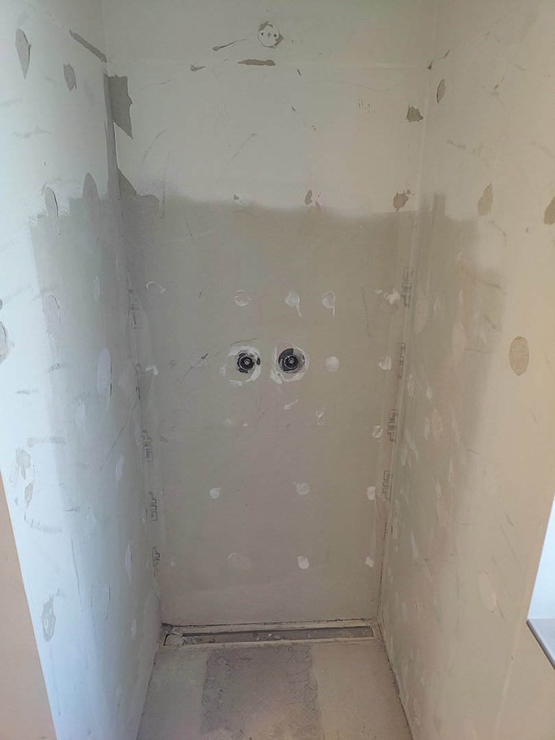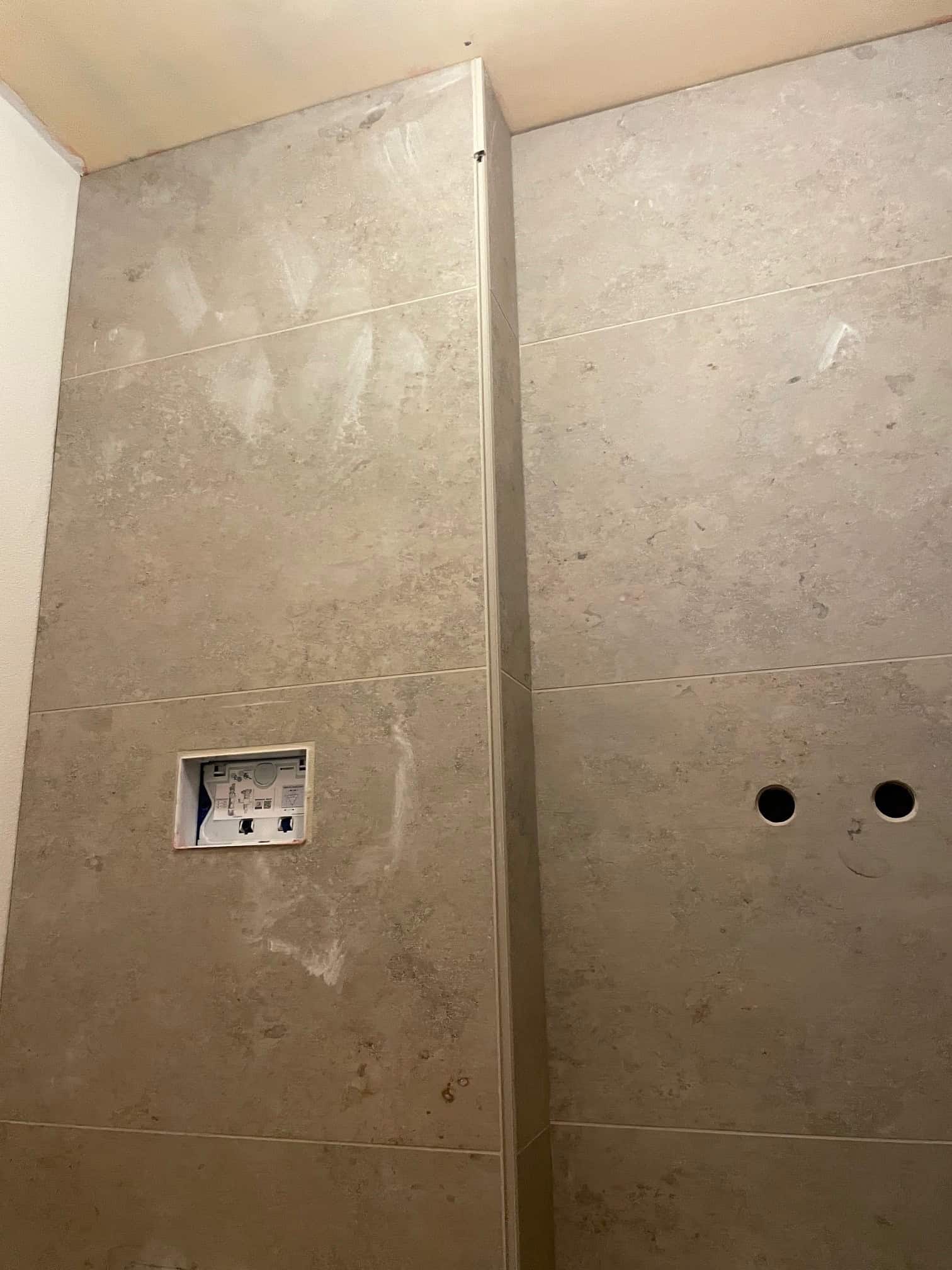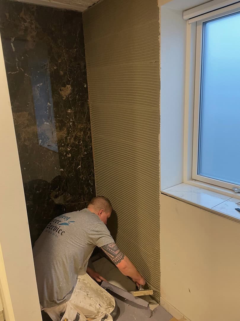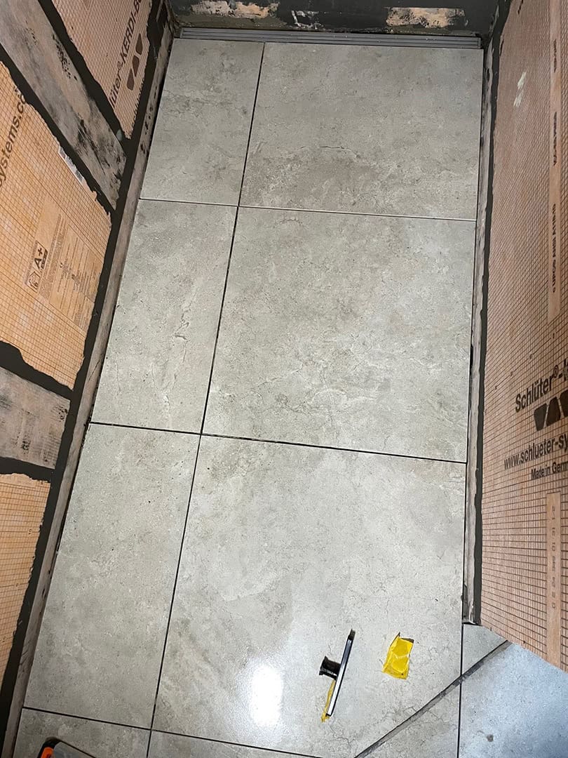 Arbejdet startede med fejlsøgning og komplet demontering af de gamle fliser. Til genopbygningen har vi anvendt vådrumssystem og skinner fra Schlüter-Systems (Kerdi 200) for at sikre en tæt og holdbar løsning.