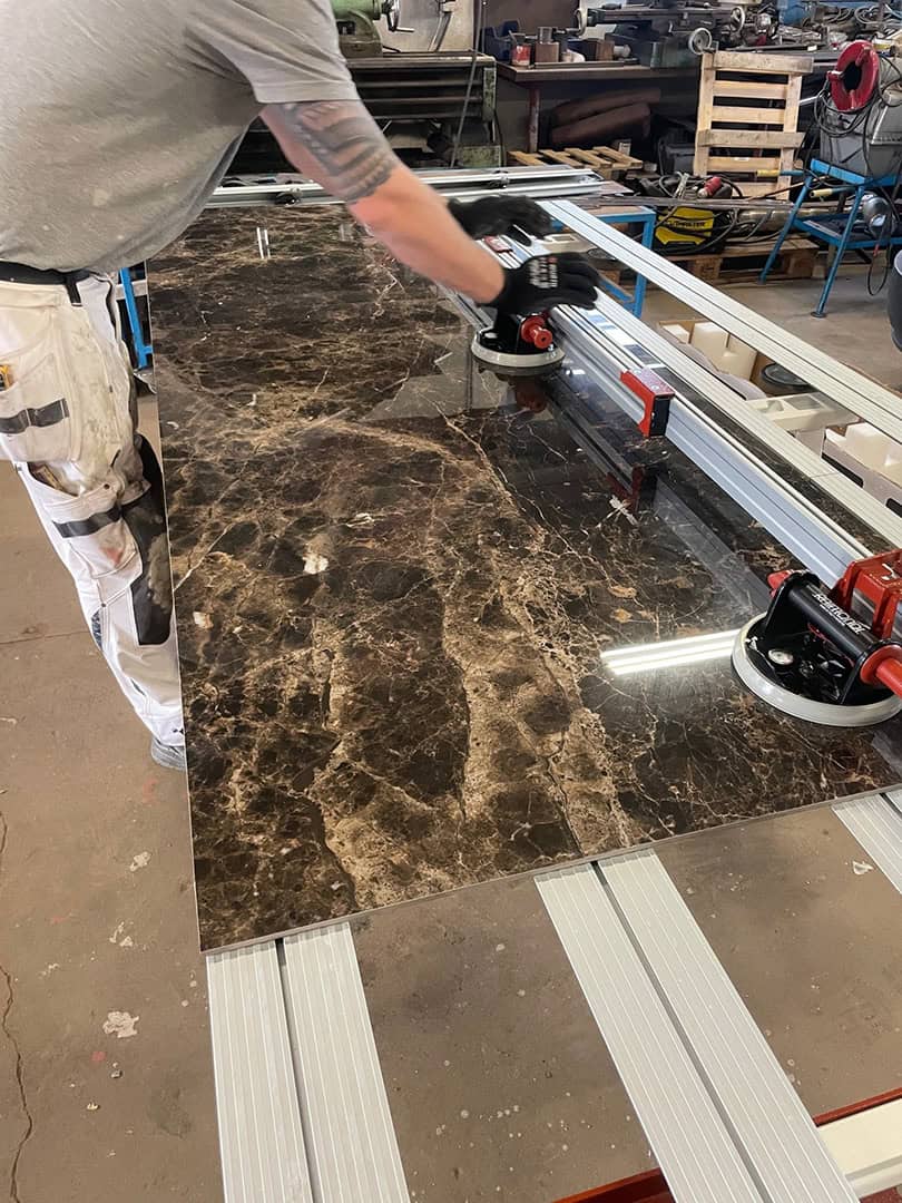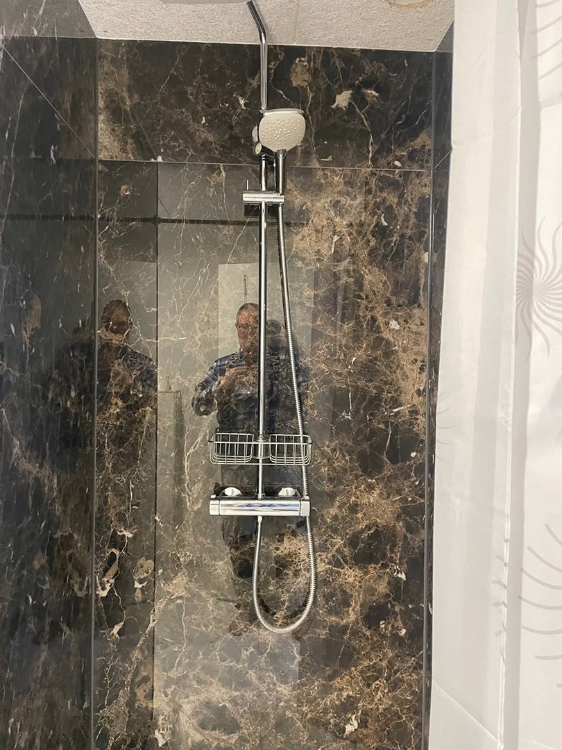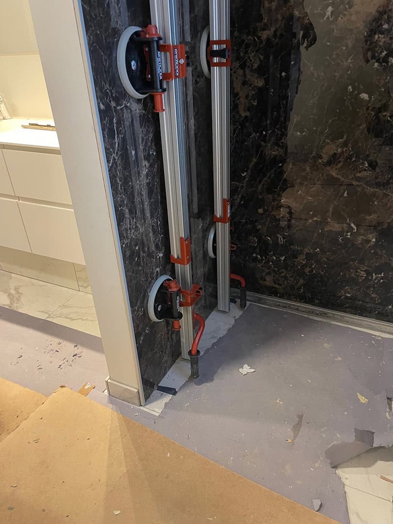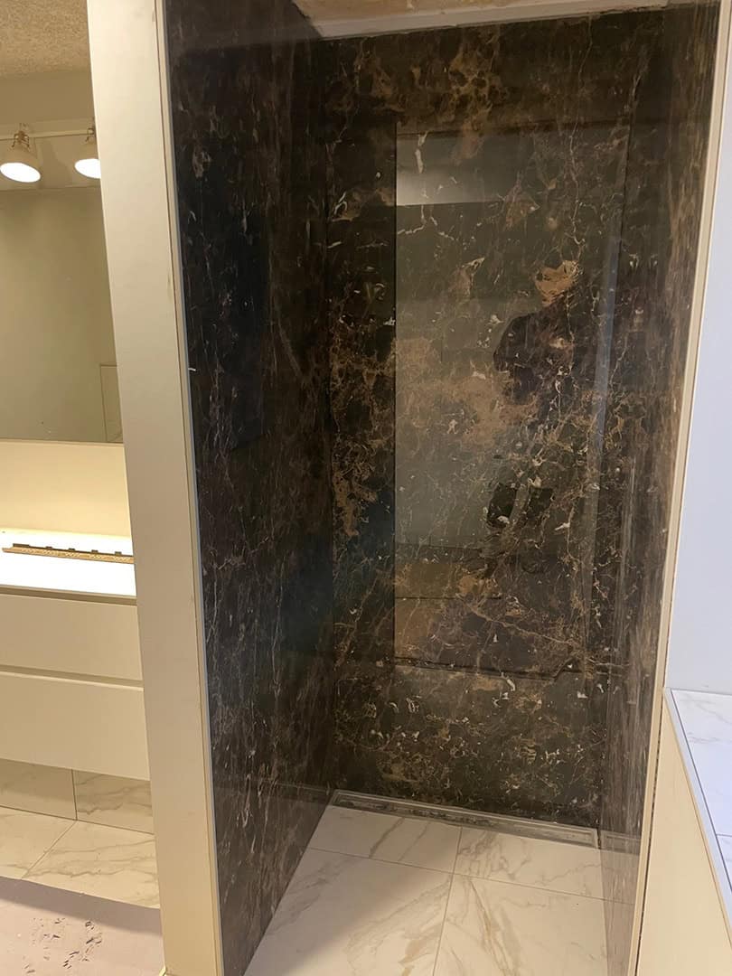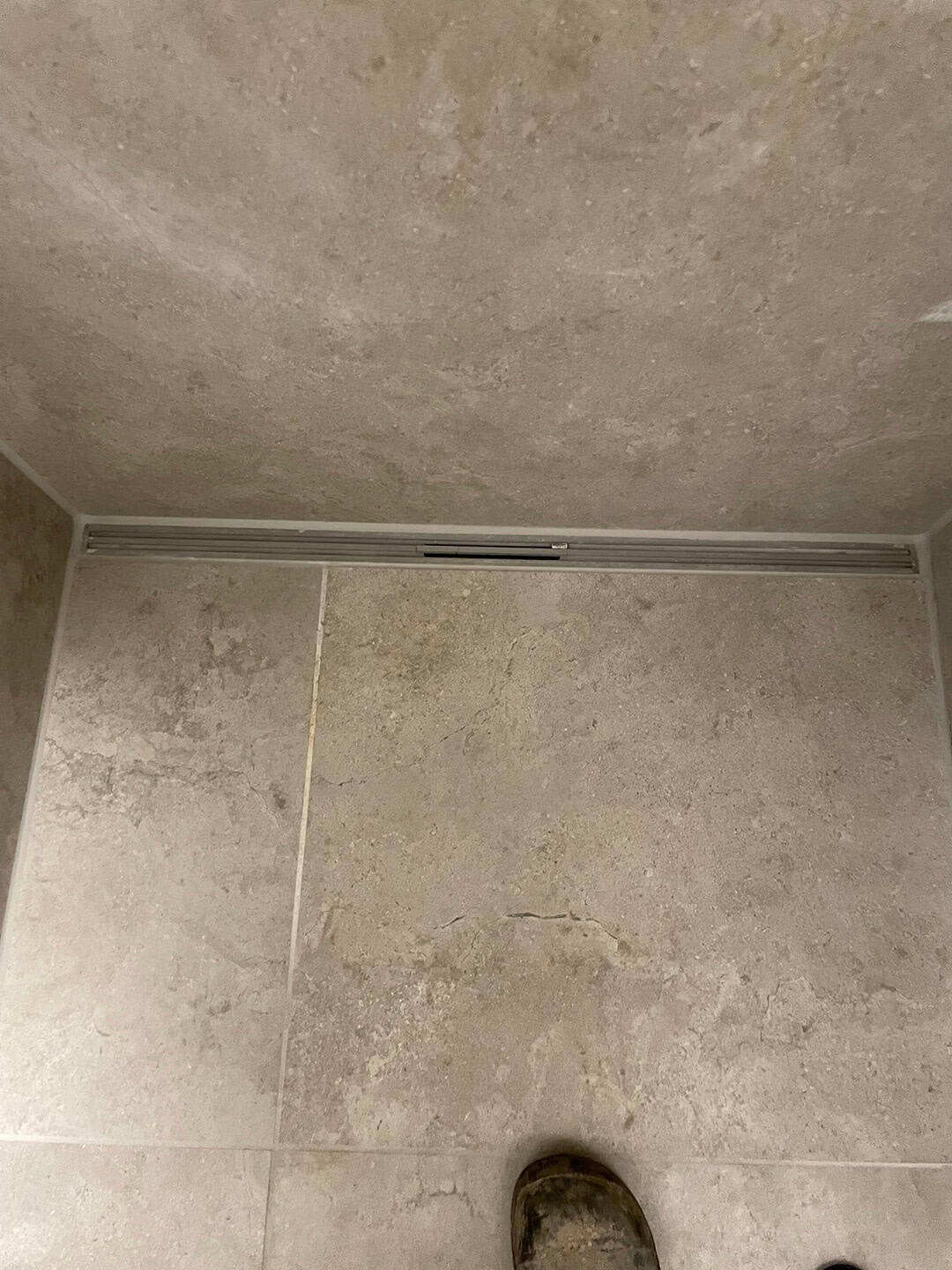 Arbejdet startede med fejlsøgning og komplet demontering af de gamle fliser. Til genopbygningen har vi anvendt vådrumssystem og skinner fra Schlüter-Systems (Kerdi 200) for at sikre en tæt og holdbar løsning.