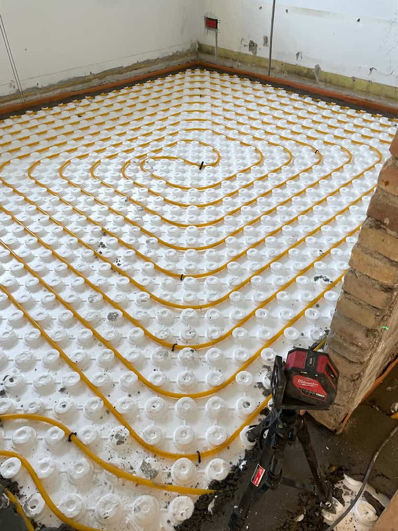 - Varme & Sikring: Vandbåret gulvvarme og styresystem fra Schlüter-Systems samt vådrumssikring med Kerdi 200 og afspændingsmåtter.